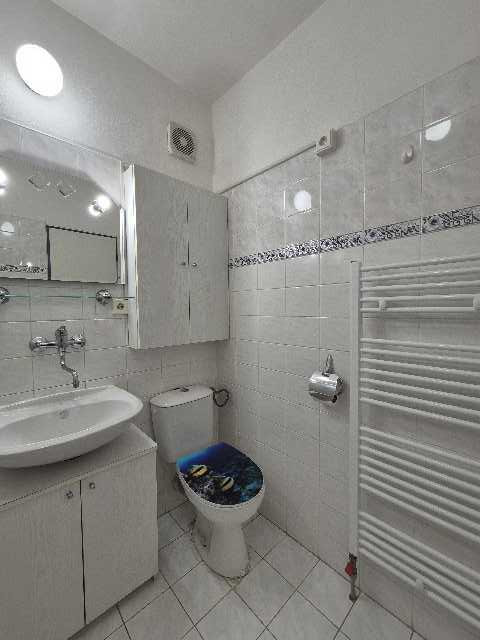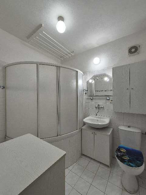 Koupelna s WC dohromady – umyvadlo s umyvadlovou skříňkou, nástěnné zrcadlo, skleněná police, sprchový kout, přípojka na pračku, WC.