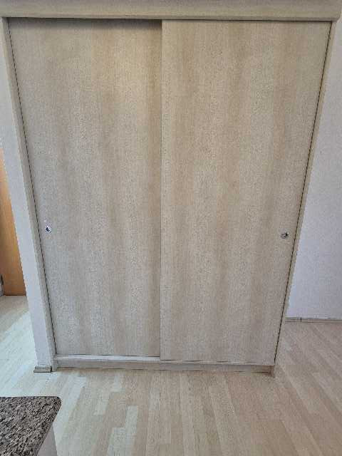 Kuchyně s pokojem dohromady – kuchyňská linka, elektrický dvoukolový vařič, digestoř, šatní skříň.