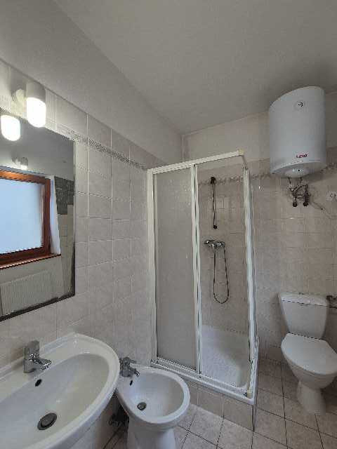 Koupelna s WC dohromady – umyvadlo, sprchový kout, přípojka na pračku, bidet a WC.
