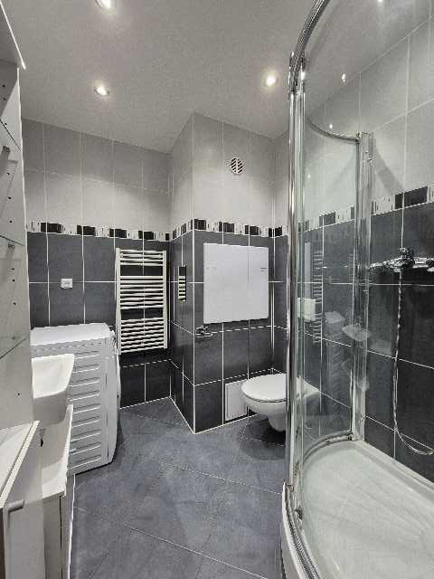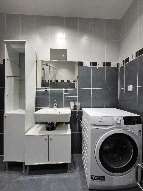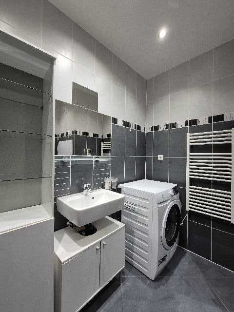 Koupelna – sprchový kout, závěsné WC, umyvadlo se skříňkou, elektrický žebřík, polička, přípojka na pračku, pračka.