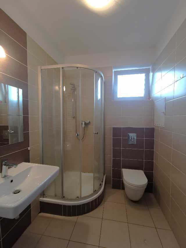 Koupelna – umyvadlo, nástěnné zrcadlo s osvětlením, sprchový kout, WC, přípojka na pračku, pračka, plynový kotel.