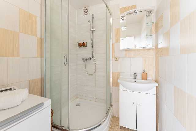 Koupelna – umyvadlo se spodní skříňkou, nástěnné zrcadlo s policemi a s osvětlením, sprchový kout, přípojka na pračku, pračka.